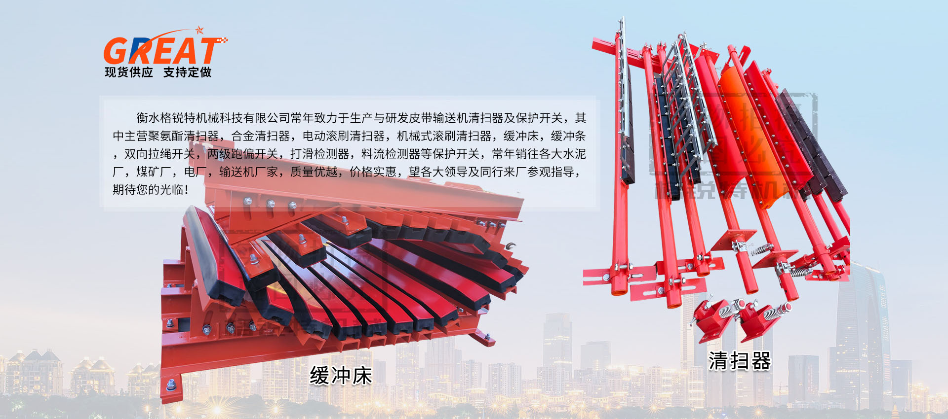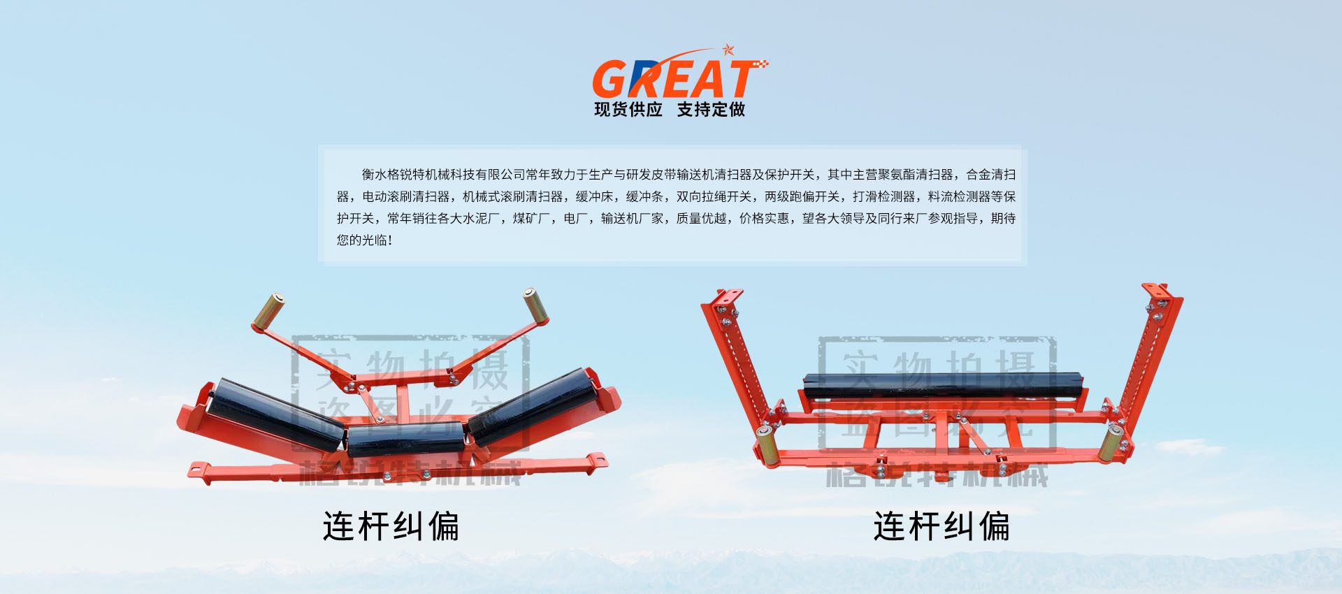 衡水格銳特機械科技有限公司常年致力于生產與研發皮帶輸送機清掃器及保護開關,其中主營聚氨酯清掃器,合金清掃器,電動滾刷清掃器,機械式滾刷清掃器,緩沖床,緩沖條,雙向拉繩開關,兩級跑偏開關,打滑檢測器,料流檢測器等保護開關,常年銷往各大水泥廠,煤礦廠,電廠,輸送機廠家,質量優越,價格實惠,望各大領導及同行來廠參觀指導,期待您的光臨?。?!